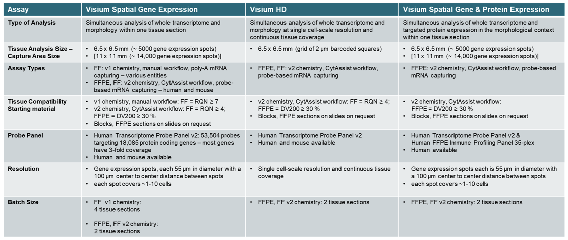 - Visium CytAssist probe-based assays for human and mouse Fresh Frozen or FFPE blocks, pre-sectioned FFPE tissue on glass slides