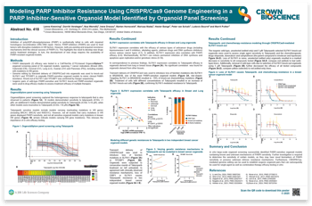 Inhibition of poly(ADP-ribose)polymerase (PARP) is synthetically lethal in cells with impaired homologous recombination (HR) DNA repair. Hence, PARP-inhibitors (PARPi) are used to treat tumors with disruptive mutations in HR factors. However, both pre-existing and acquired resistance mechanisms limit the clinical success of PARPi (1). This highlights the need to develop new drugs and/or treatment strategies. In turn, the development of new drugs requires the availability of PARPi-resistant organoid models.