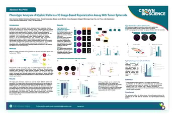 This poster details our in-house developed image analysis software and machine learning, a set of morphological features was identified that reproducibly allowed discrimination between undifferentiated monocytes, M1 and M2 macrophages and dendritic cells. In addition, these phenotypic profiles of the myeloid cells could be analyzed in the presence of the tumor supernatants or in co-cultures with tumor cells. This assay thereby allows a better understanding of the suppressive tumor microenvironment including multiple cell types and is well suited to test different cancer immunotherapies.