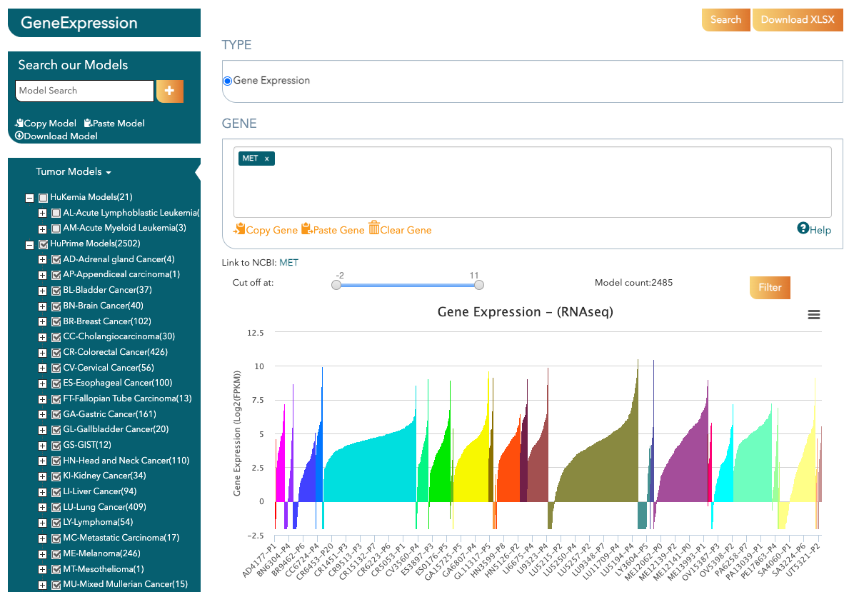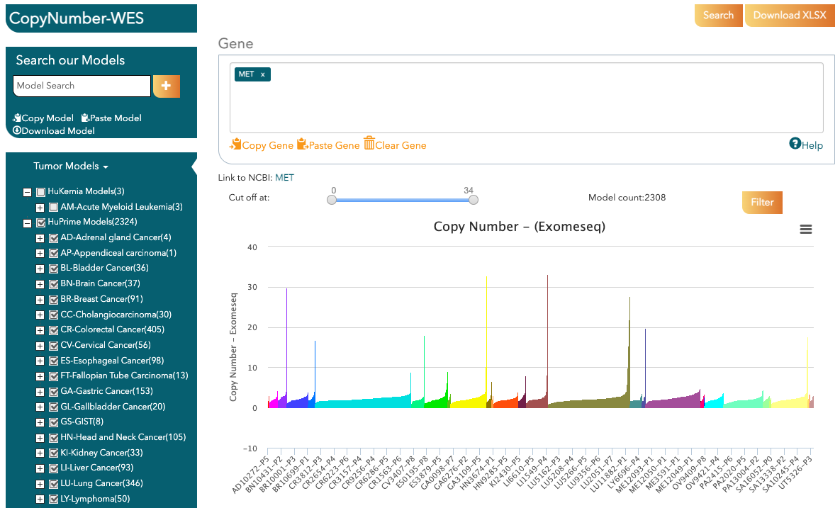 Search PDX genomic information e.g. RNAseq gene expressions data and WES gene copy number data for MET amplification.