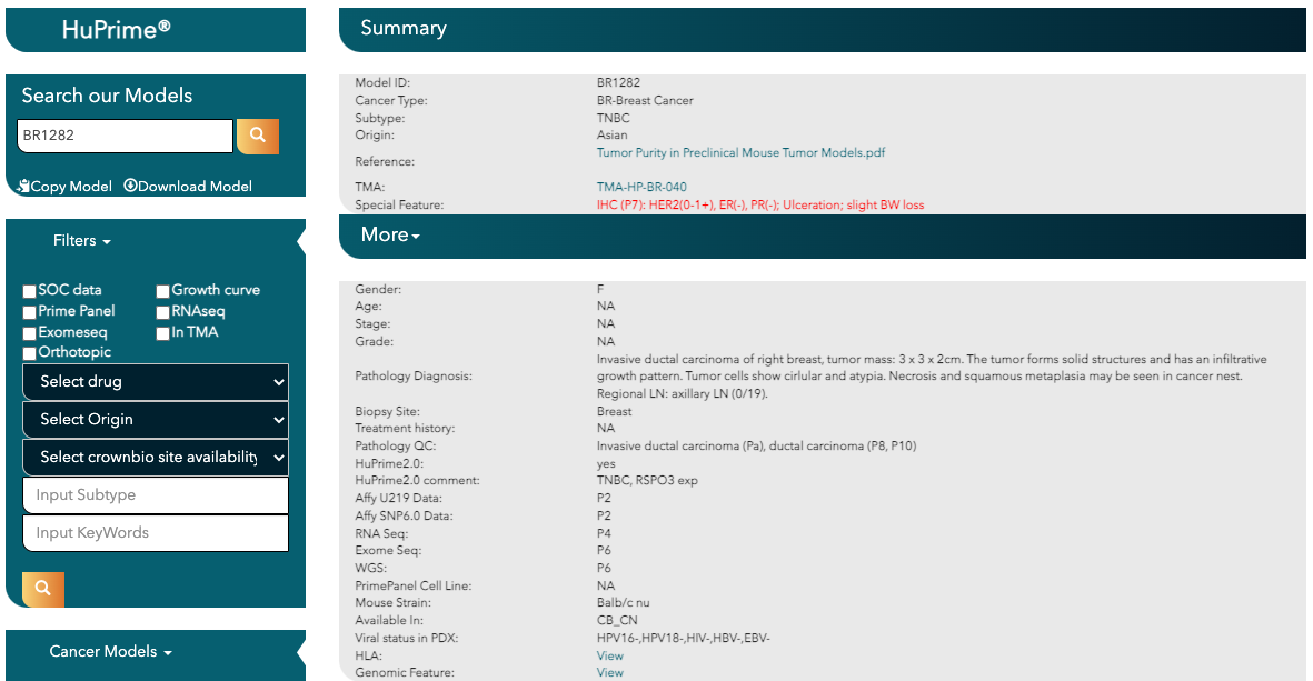 Extensive characterization data in our searchable PDX model database include: RNAseq of over 1,500 models, whole exome sequencing of over 680 models, histology, growth kinetics, and SoC and investigative treatment data.