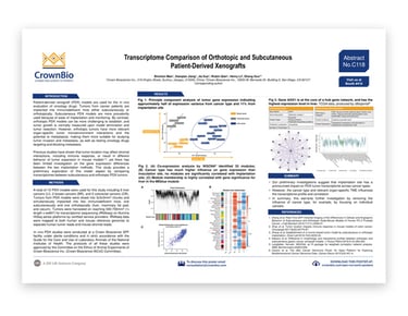 This poster details preliminary investigations into transcriptome differences between subcutaneous and orthotopic patient-derived xenograft (PDX) models. PDX are commonly used in the subcutaneous setting, but have more relevant organ-specific tumor microenvironment interactions and metastasis potential when implanted orthotopically.