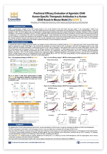 To meet this need, CrownBio has developed a humanized drug target knock-in GEMM, where the entire mouse OX40 coding region is replaced with the human counterpart, allowing assessment of OX40 human-specific mAb therapeutics.