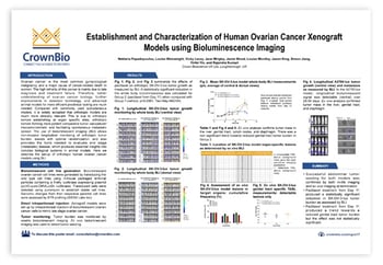 Combining orthotopic models with bioluminescent imaging (BLI) allows non-invasive longitudinal monitoring of orthotopic tumor burden, assists in optimal randomization, and also provides tools to evaluate end stage (metastatic) disease. This poster details the development and characterization of orthotopic human ovarian cancer models using BLI.