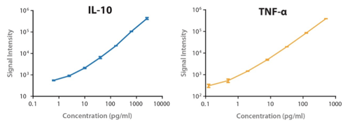 Crown Bioscience's custom-fit, 7-point standard curves used to calculate accurate and precise concentrations for IL-10 and TNF-α.