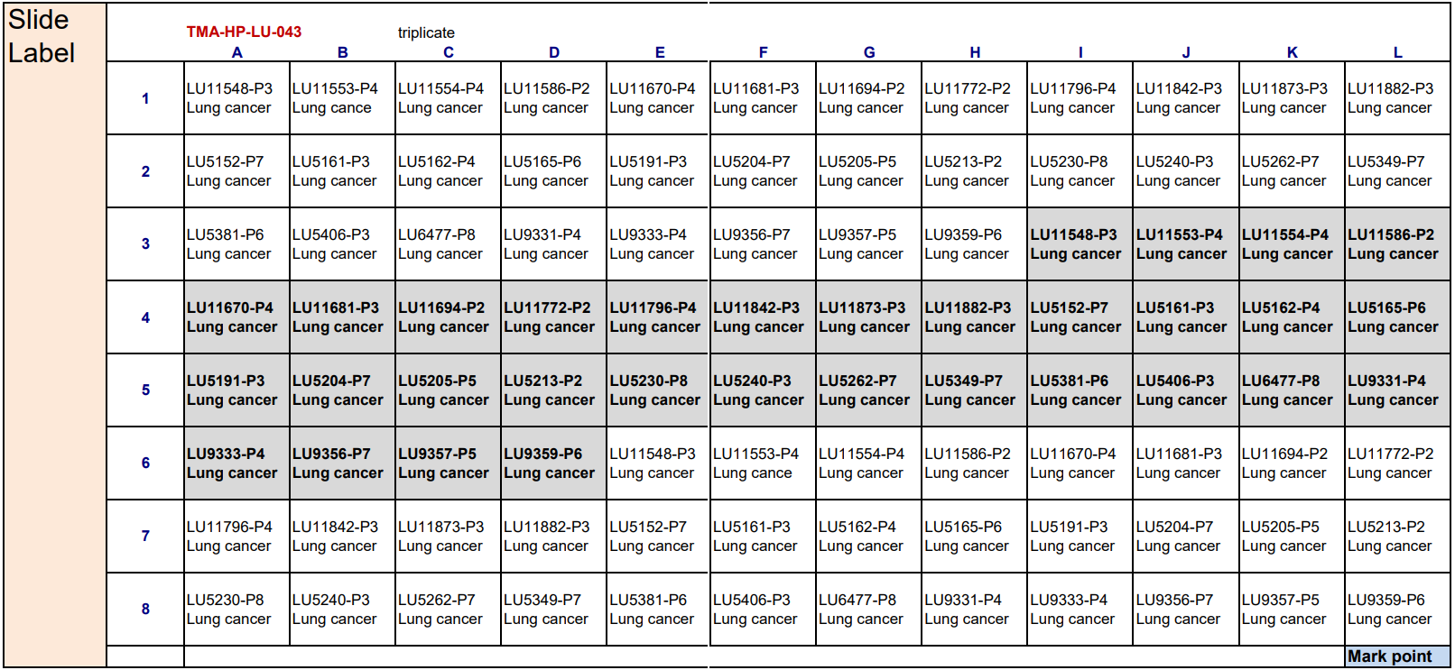 Map of lung cancer tumor microarray slide
