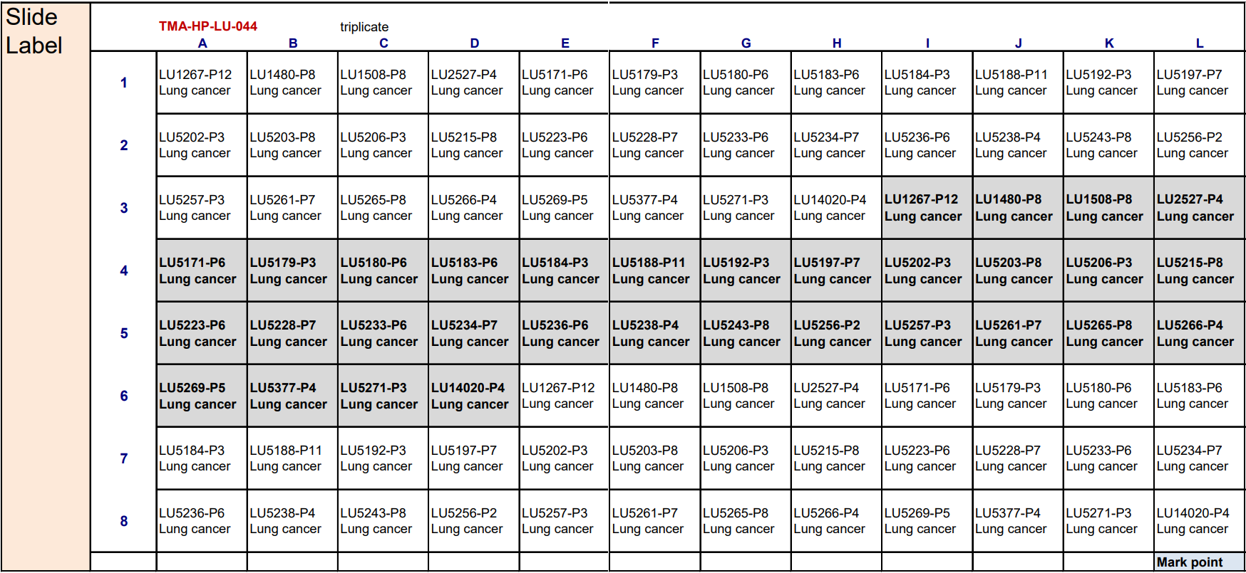 | QC | Each TMA slide has >90% core occupancy. H&E and Ki67 IHC staining have been performed on a representative slide of each lot of TMA product. |