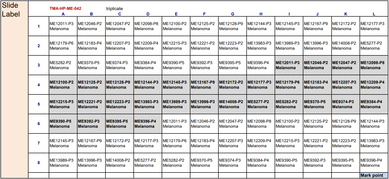 | QC | Each TMA slide has >90% core occupancy. H&E and Ki67 IHC staining have been performed on a representative slide of each lot of TMA product. |