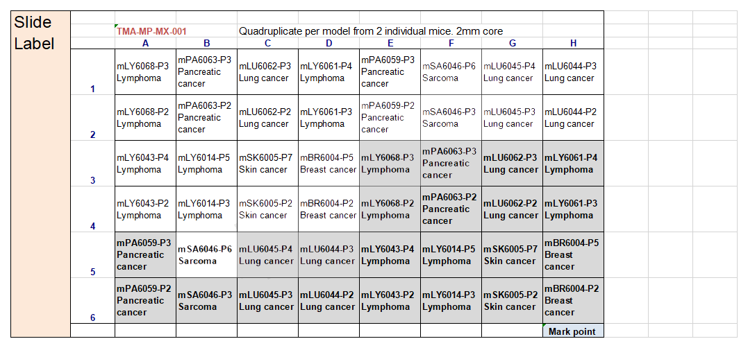 This MuPrime tumor microarray is derived from MuPrime primary tumor homografts. Each tumor sample is formalin fixed, paraffin embedded, and spotted in triplicate on the TMA.
