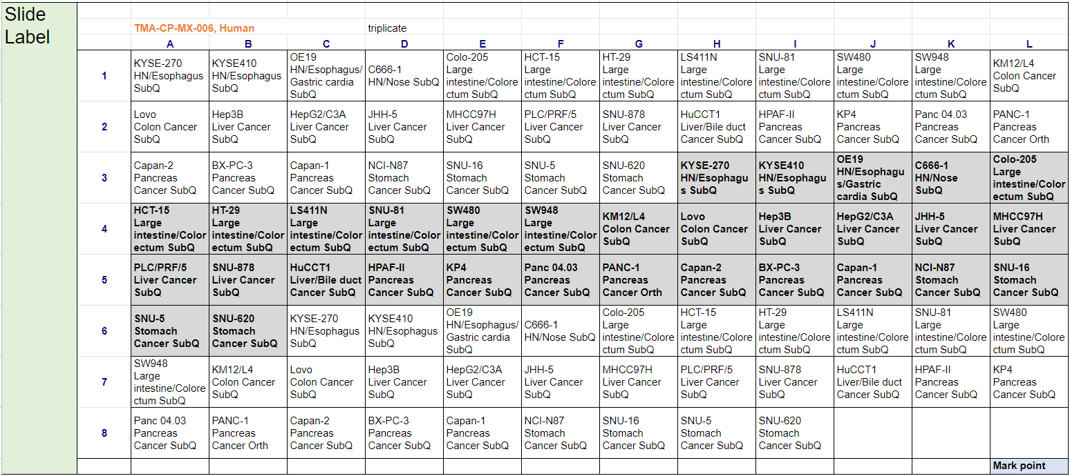 | QC | Each TMA slide has >90% core occupancy. H&E and Ki67 IHC staining have been performed on a representative slide of each lot of TMA product. |