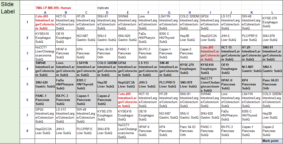 Map of mixed cancer types tumor microarray slide