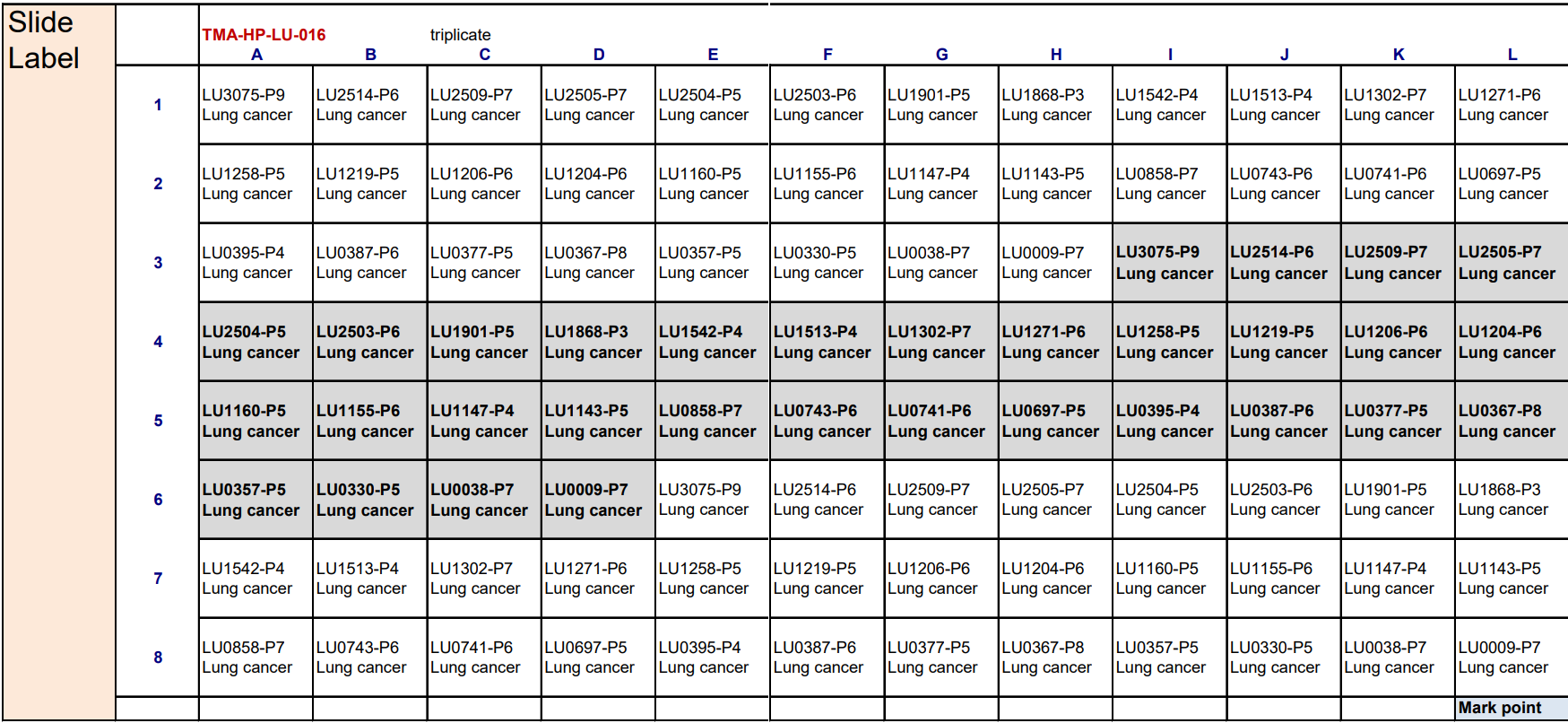 | QC | Each TMA slide has >90% core occupancy. H&E and Ki67 IHC staining have been performed on a representative slide of each lot of TMA product. |