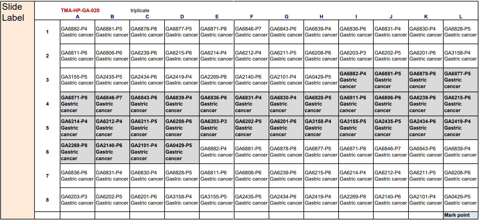 Map of gastric cancer tumor microarray slide