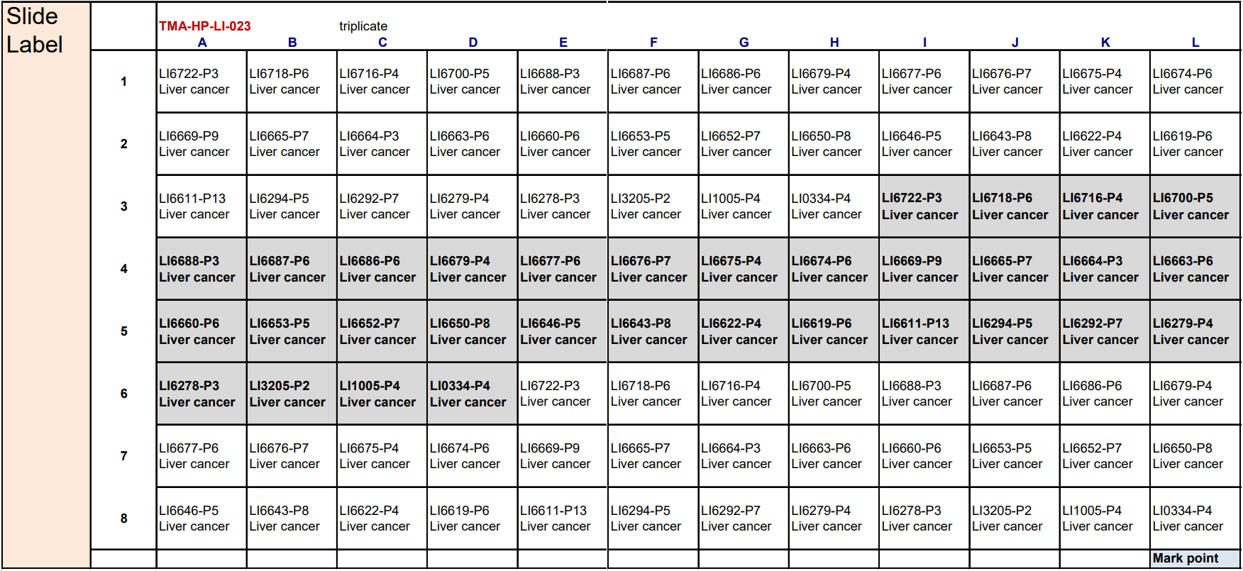 Map of liver cancer tumor microarray slide
