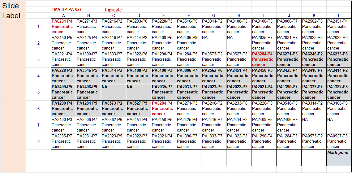 Map of pancreatic cancer tumor microarray slide