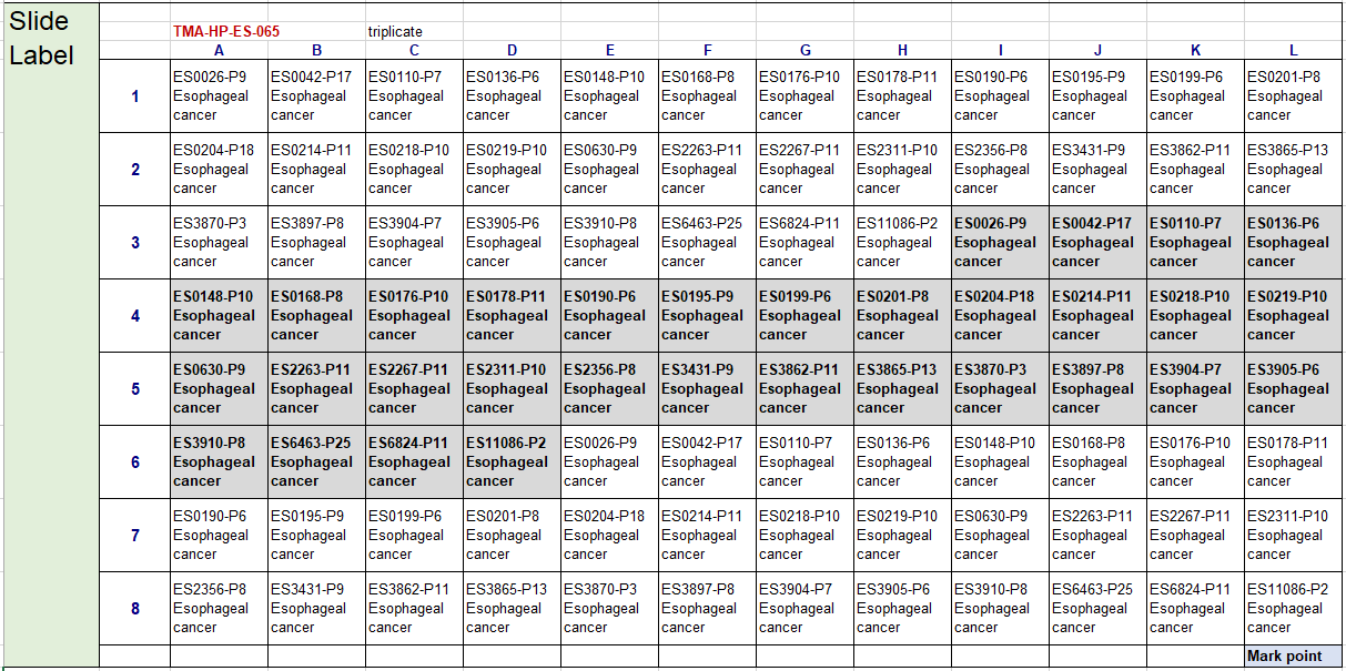 Map of esophageal cancer tumor microarray slide