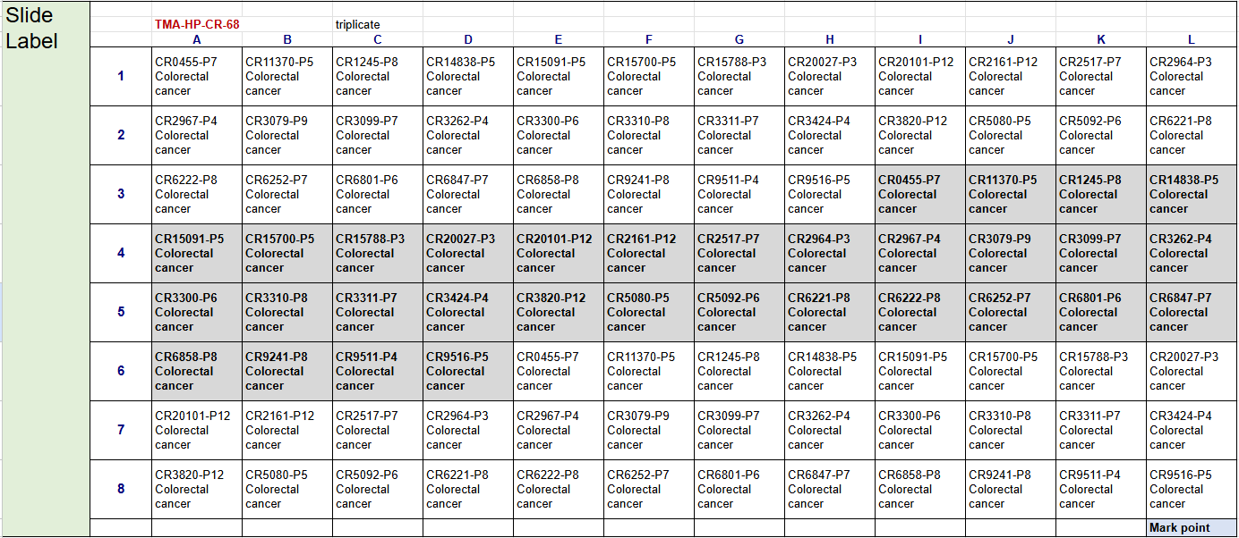 Map of colorectal tumor microarray slide